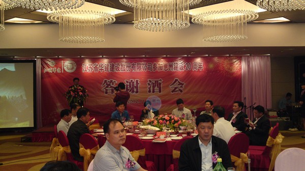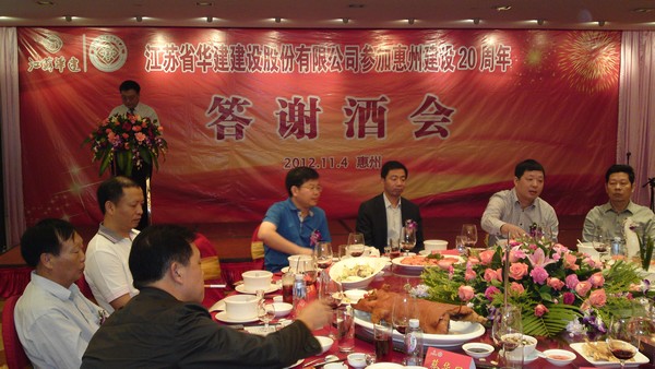 11月4日,公司在惠州凱賓斯基酒店王子飯店隆重召開參加惠州建設(shè)20周年慶典暨答謝酒會(huì),公司副董事長、總經(jīng)理宗有農(nóng)主持酒會(huì)并作開場致辭。惠州市有關(guān)政府部門、部分合作方企業(yè)的負(fù)責(zé)人,華建聯(lián)盟成員單位負(fù)責(zé)人,公司董事、監(jiān)事和高管等130余人出席慶典。惠州公司總經(jīng)理華恒榮介紹了公司參加惠州建設(shè)20年的有關(guān)情況。惠州市工商聯(lián)主席、公司戰(zhàn)略合作伙伴恒宇實(shí)業(yè)集團(tuán)公司董事長楊滿芳代表合作方發(fā)言,惠州市住房和城鄉(xiāng)規(guī)劃建設(shè)局副局長陳訓(xùn)政代表政府主管部門致辭,分別對(duì)江蘇華建進(jìn)駐惠州施工、參加惠州建設(shè)20周年表示祝賀。公司董事長陸金龍代表公司總部對(duì)惠州市有關(guān)政府部門、相關(guān)合作方和社會(huì)各界人士給予公司的關(guān)心和支持表示誠摯的感謝,并表達(dá)了進(jìn)一步加大支持力度、加強(qiáng)戰(zhàn)略合作、加快科學(xué)發(fā)展的意愿。