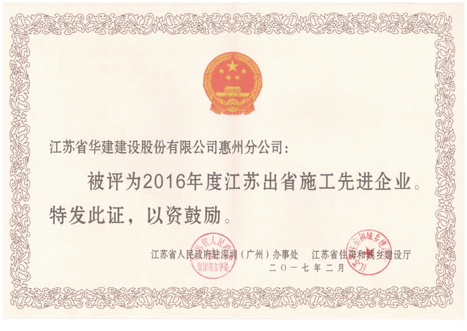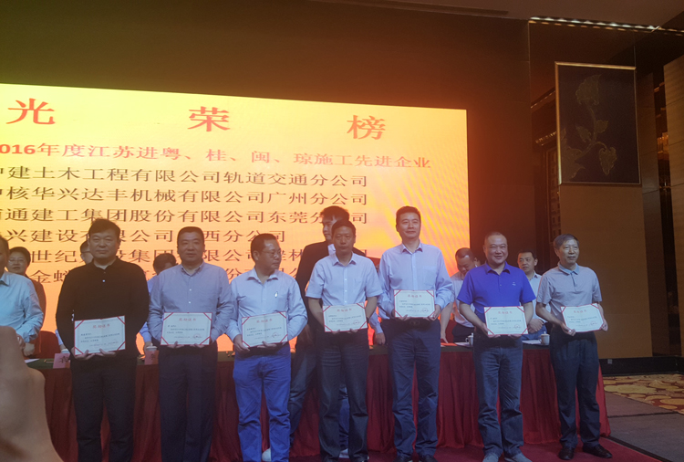 惠州公司榮獲“2016年度江蘇出省施工先進企業”稱號 時間:2017-03-28 2745 3月24日,江蘇省人民政府駐深圳(廣州)辦事處和江蘇省住房和城鄉建設廳在海口召開2017年江蘇建筑業南方區工作會議,表彰了一批施工先進企業、優秀企業經理、優秀建造師和先進個人。惠州公司獲評“2016年度江蘇出省施工先進企業”,總經理周群利被評為優秀企業經理,黃秀剛被表彰為質量安全先進個人,邵群斌被表彰為經營財務先進個人,劉磊被表彰為新聞報道先進個人。