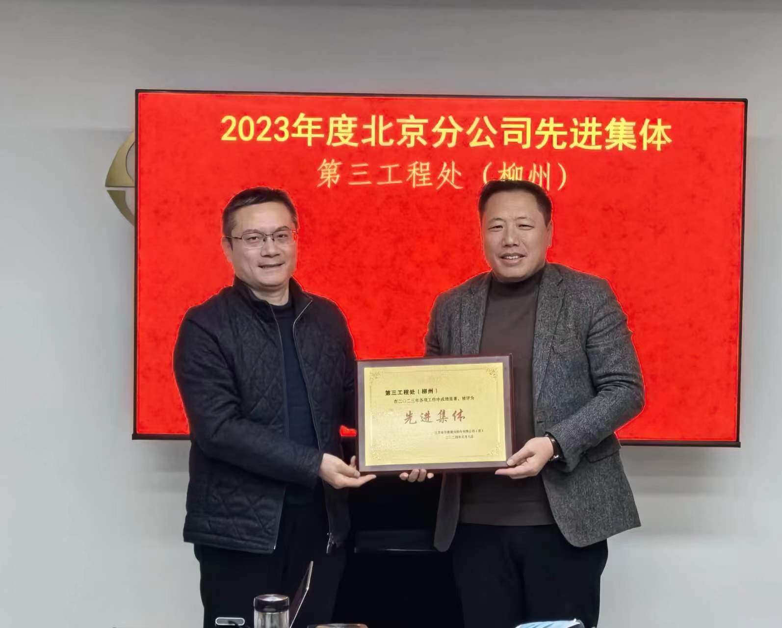 副總經(jīng)理陳永明宣讀關(guān)于表彰公司2023年度先進(jìn)集體和先進(jìn)個(gè)人的決定,戴壯民、朱靖為獲獎(jiǎng)工程處代表進(jìn)行頒獎(jiǎng)并合影。