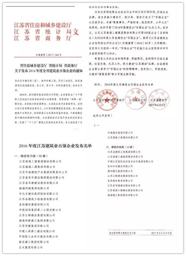 近日,江蘇省住房和城鄉(xiāng)建設(shè)廳、江蘇省商務(wù)廳、江蘇省統(tǒng)計局聯(lián)合發(fā)布了“2016年度全省建筑業(yè)百強企業(yè)”榜單,江蘇華建位列綜合實力類第5名。