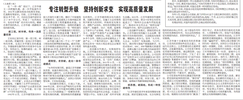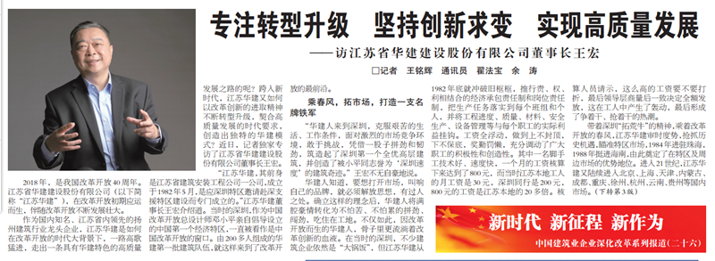 王宏董事長接受《建筑時報》專訪:專注轉型升級,堅持創新求變,實現高質量發展 時間:2018-09-11 4138 9月10日,《建筑時報》頭版及微信公眾號對王宏董事長的專訪給予了刊載。 王宏董事長在專訪中就江蘇華建成立36年來,是如何在改革開放的時代大背景下,走出一條具有華建特色的高質量發展之路,跨入新時代,江蘇華建又是如何以改革創新的進取精神不斷轉型升級,契合高質量發展的時代要求,創造出獨特的華建模式進行了詳細介紹。