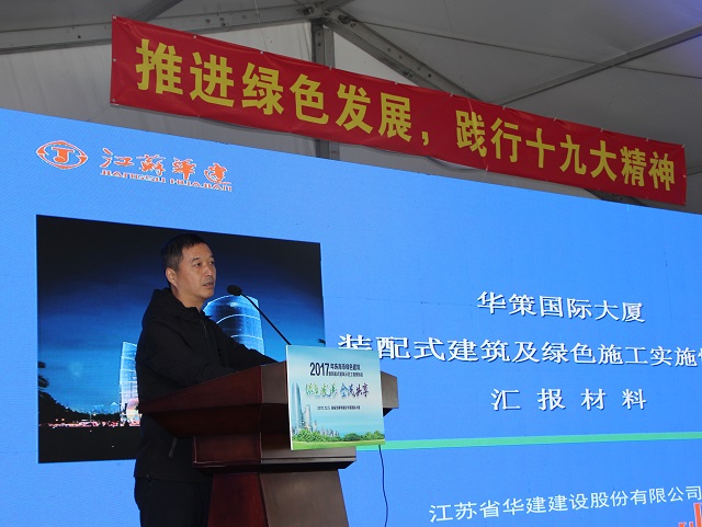 公司總工周學軍在現場會上對華策國際大廈工程綠色施工和裝配式技術應用情況進行了介紹