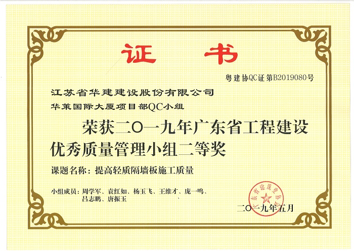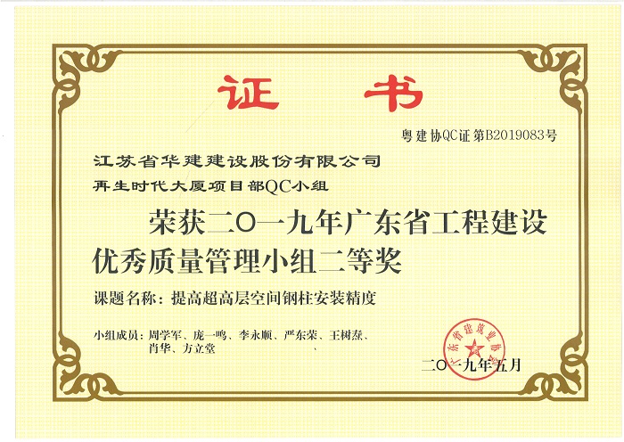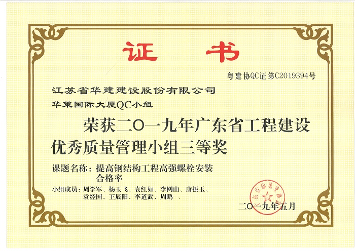 公司新添4項省級工程建設優秀QC成果 時間:2019-07-11 3835 近期,廣東省建筑業協會發文公布了2019年度廣東省工程建設優秀質量管理小組名單,公司華策國際大廈項目部QC小組“提高輕質隔墻板施工質量”、再生時代項目部QC小組“提高超高層空間鋼柱安裝精度”兩項成果喜獲二等獎,華策國際大廈項目部QC小組“提高鋼結構工程高強螺栓安裝合格率”榮獲三等獎。 華策國際大廈項目部QC小組“設備機房減振降噪的創新方法”成果在江蘇省建筑業協會組織的2019年度江蘇省工程建設質量管理小組活動中榮獲二等獎。