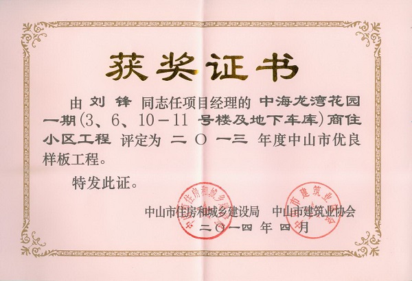 2013年度中海龍灣花園一期商住小區工程中山市優良樣板工程