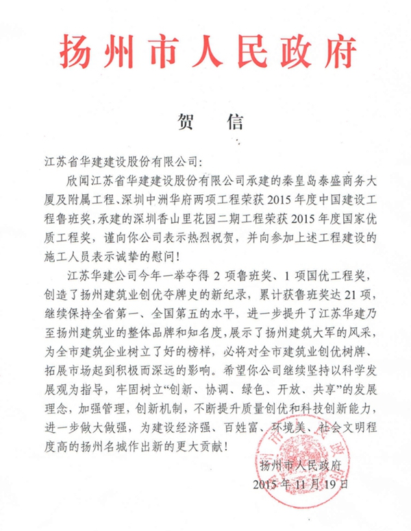 近日,揚(yáng)州市政府專程向江蘇華建發(fā)來賀信,祝賀公司一年內(nèi)獲得2項(xiàng)魯班獎,1項(xiàng)國優(yōu)獎。公司今年...