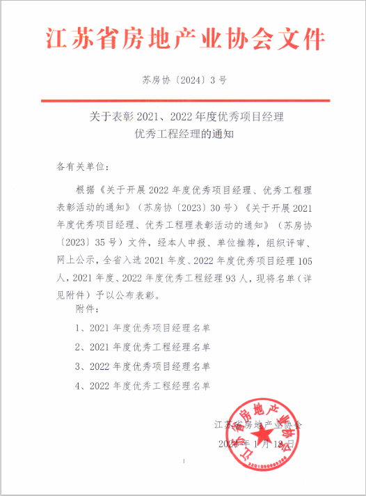 近日,江蘇省房地產協會公布了《關于表彰2021、2022年度優秀項目經理、優秀工程經理的通...