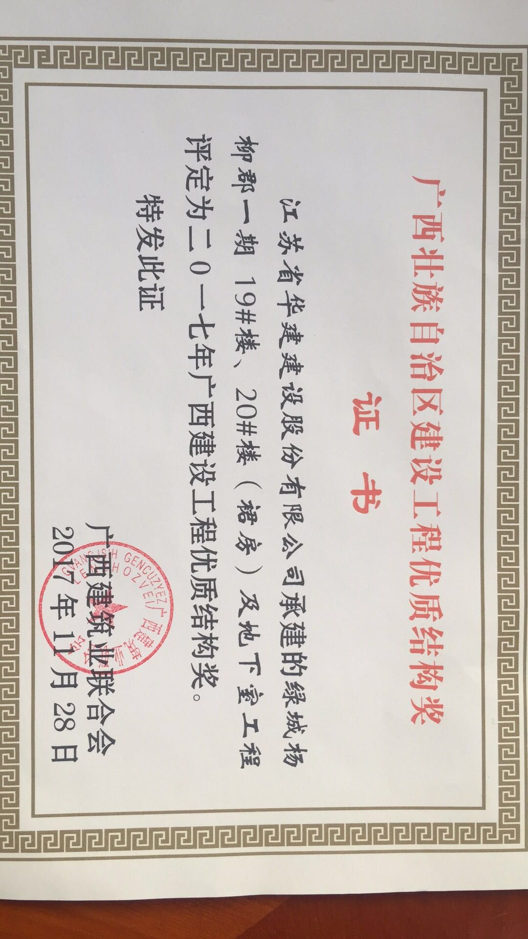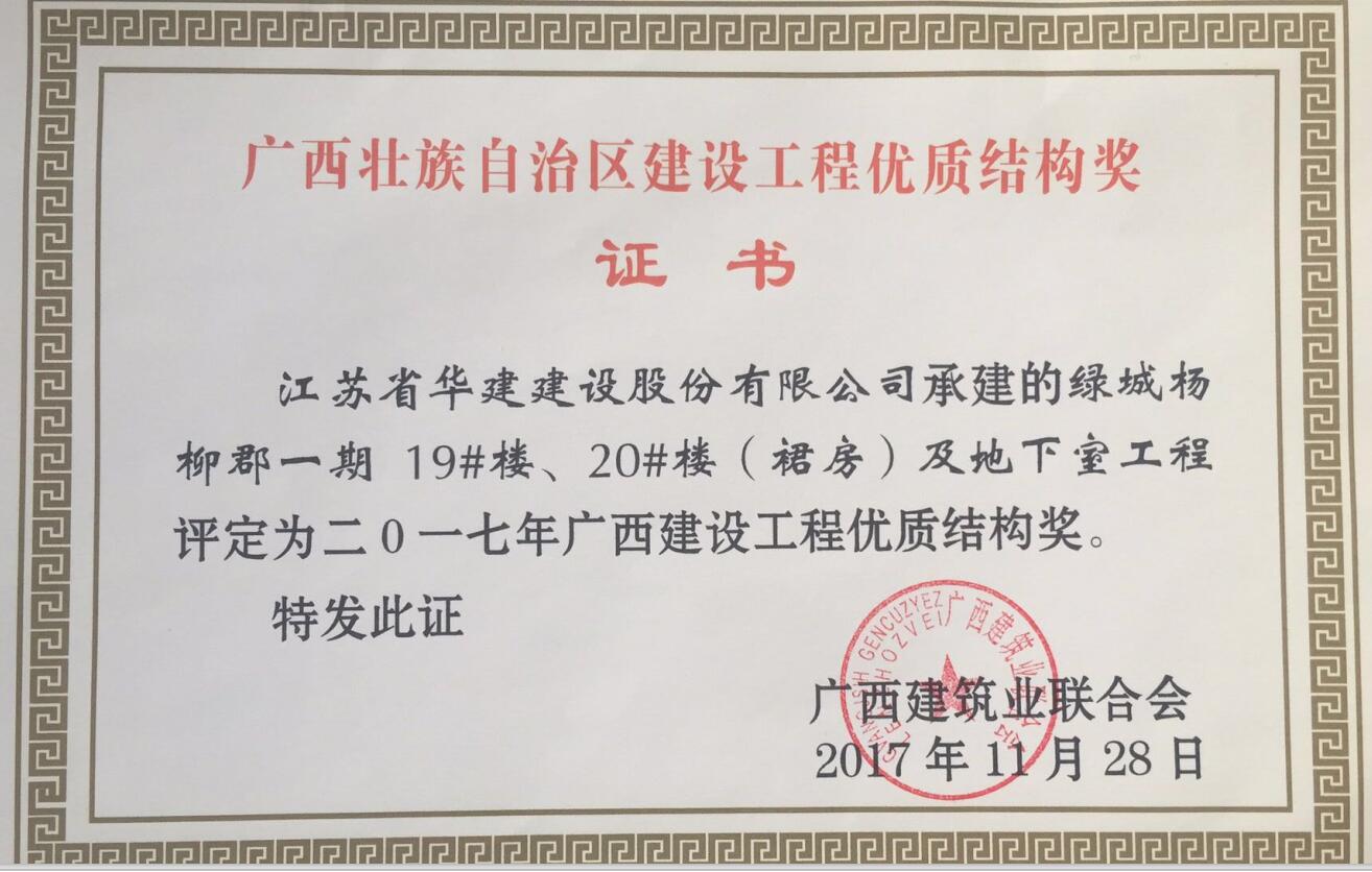 近期從廣西建筑業(yè)聯(lián)合會獲悉,我公司總承包施工的廣西自治區(qū)柳州市“綠城楊柳郡一期19#、20#樓(裙房)及地下室工程”和“綠城楊柳郡一期15#樓及地下室工程”兩項工程被評定為二0一七年廣西建設(shè)工程優(yōu)質(zhì)結(jié)構(gòu)獎,這也是北京區(qū)域公司在廣西自治區(qū)獲獎的第一個項目。