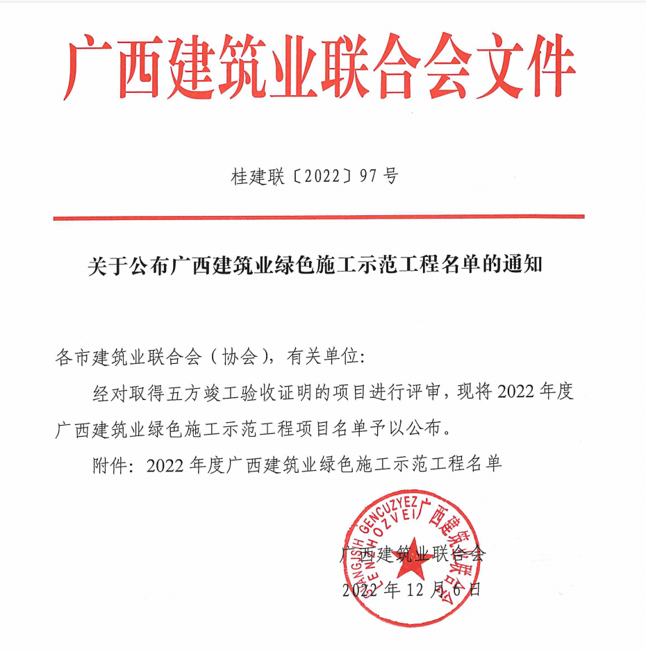 北京分公司兩項工程獲廣西建筑業綠色施工示范工程安全創優獎項 時間:2022-12-30 2081 近日,從廣西建筑業聯合會傳來喜訊,由北京公司總包承建的楊柳郡柳園1#、2#、3#、4#樓及地下室項目和楊柳郡柳園5#、6#、7#及地下室項目榮獲“2022年度廣西建筑業綠色施工示范工程”光榮稱號。