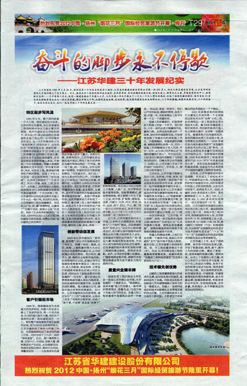 《揚州晚報》專版刊發公司三十周年宣傳文章 時間:2012-04-19 5745 4月18日,《揚州晚報》T29版刊發專版文章《奮斗的腳步永不停歇——江蘇華建三十年發展紀實》,從公司起步、市場開拓、創新發展、質量與科技等各個層面,介紹了公司三十年的奮斗歷程、綜合實力和發展業績。