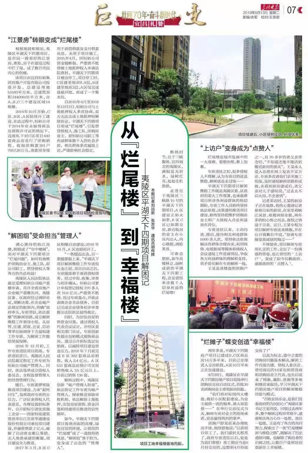 《三峽晚報》813日第7版整版報道了江蘇華建宜昌分公司總承包建設的平湖天下四期項目。