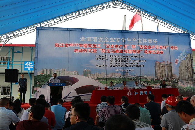 6月13日,2017年陽江市建筑工程安全生產文明施工示范工地現場觀摩會在陽江公司陽光馬德里項目隆重舉行。陽江市住房規劃建設局分管安全生產副局長,建管科、市質安監站全體人員,市建筑協會負責人,各縣(市、區)住房規劃建設局分管安全生產副局長,建管股股長、質安監站站長,市直各施工企業和監理企業分管安全生產領導、質安部門負責人,以及全市600余位建設施工企業代表參加大會并觀摩陽光馬德里施工現場。